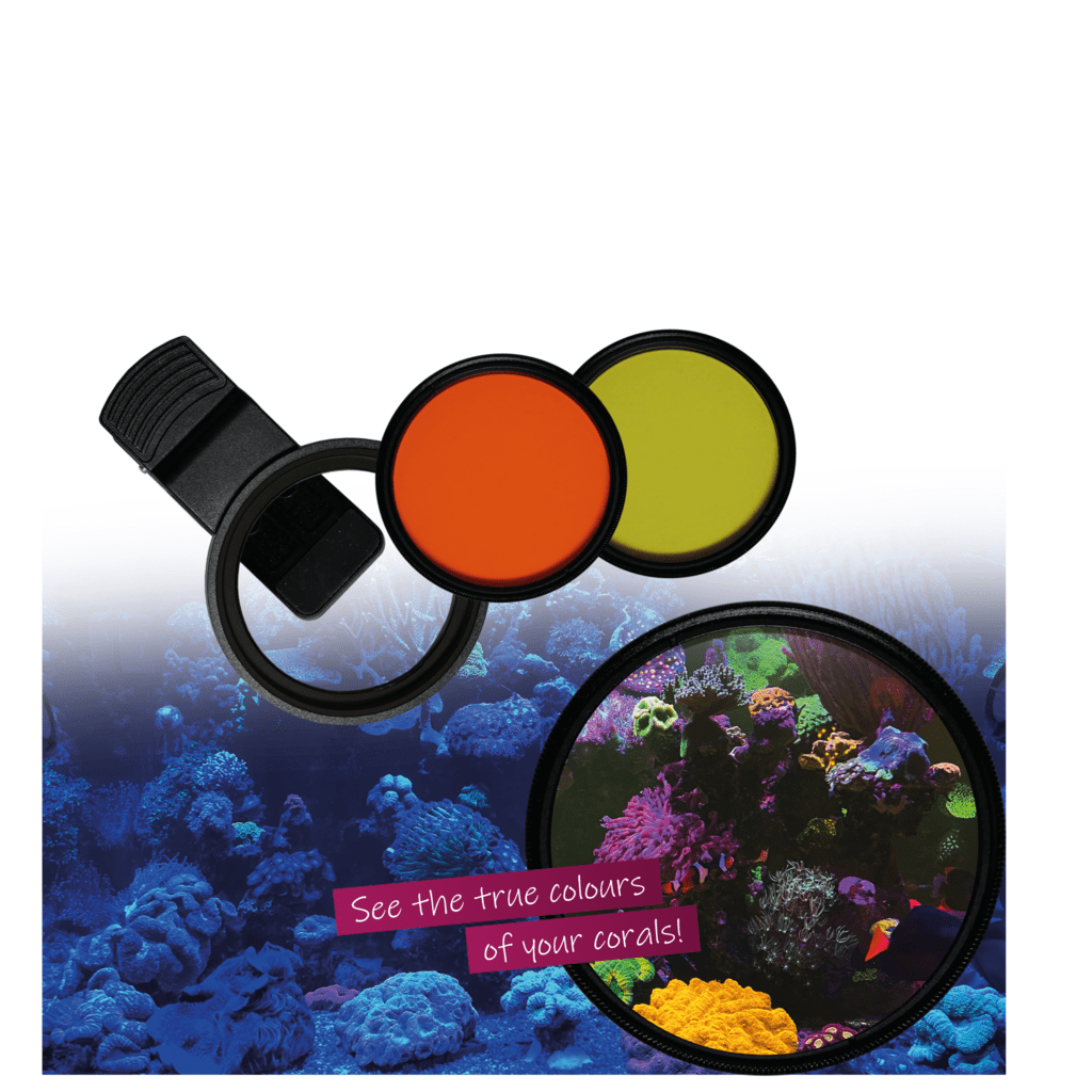 O conjunto de filtros coloridos (52 mm) pode ser conectado de forma rápida e fácil a quase todos os smartphones usando o porta-filtro. A rosca de 52 mm também é adequada para lentes para câmeras SLR com a mesma rosca. Os filtros laranja (15.000 K) e amarelo (20.000 K) absorvem o espectro de cores azuis da iluminação do aquário, permitindo que os corais apareçam em suas cores brilhantes naturais. Filtro laranja de 52 mm (15.000 K) (para melhor reprodução de cores na fase de luz azul) Filtro amarelo de 52 mm (20.000 K) (para melhor reprodução de cores no espectro da luz do dia) Porta-filtro com rosca metálica de alta qualidade para smartphones Saco de armazenamento